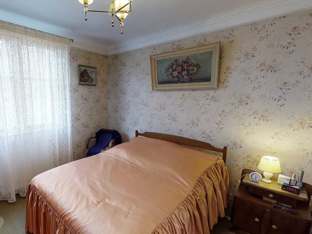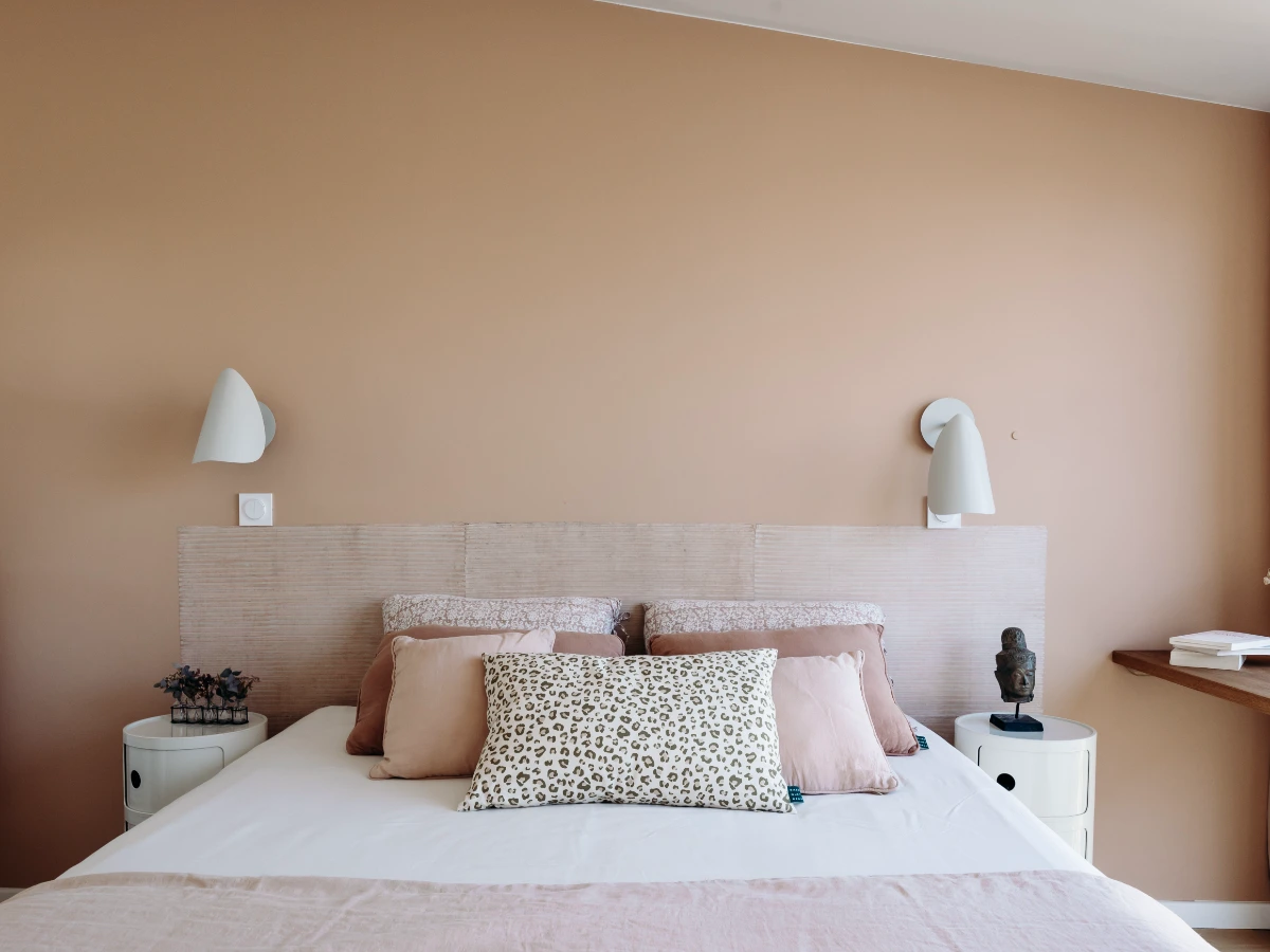 La suite parentale se veut douce et réconfortante avec ses tons rosés et ses matières naturelles. Le papier peint graphique en guise de tête de lit et les textiles aux nuances poudrées créent une atmosphère chaleureuse et enveloppante, propice au repos.