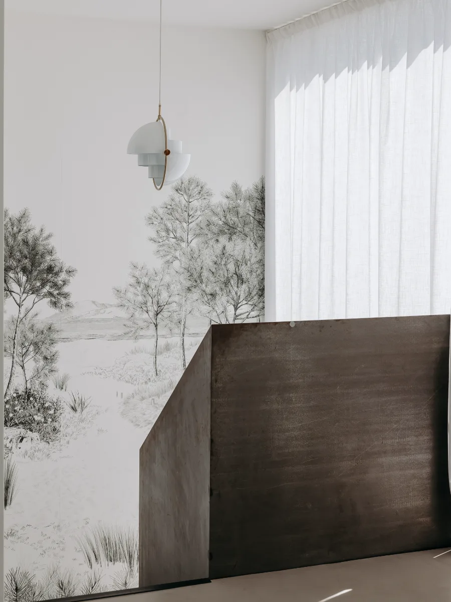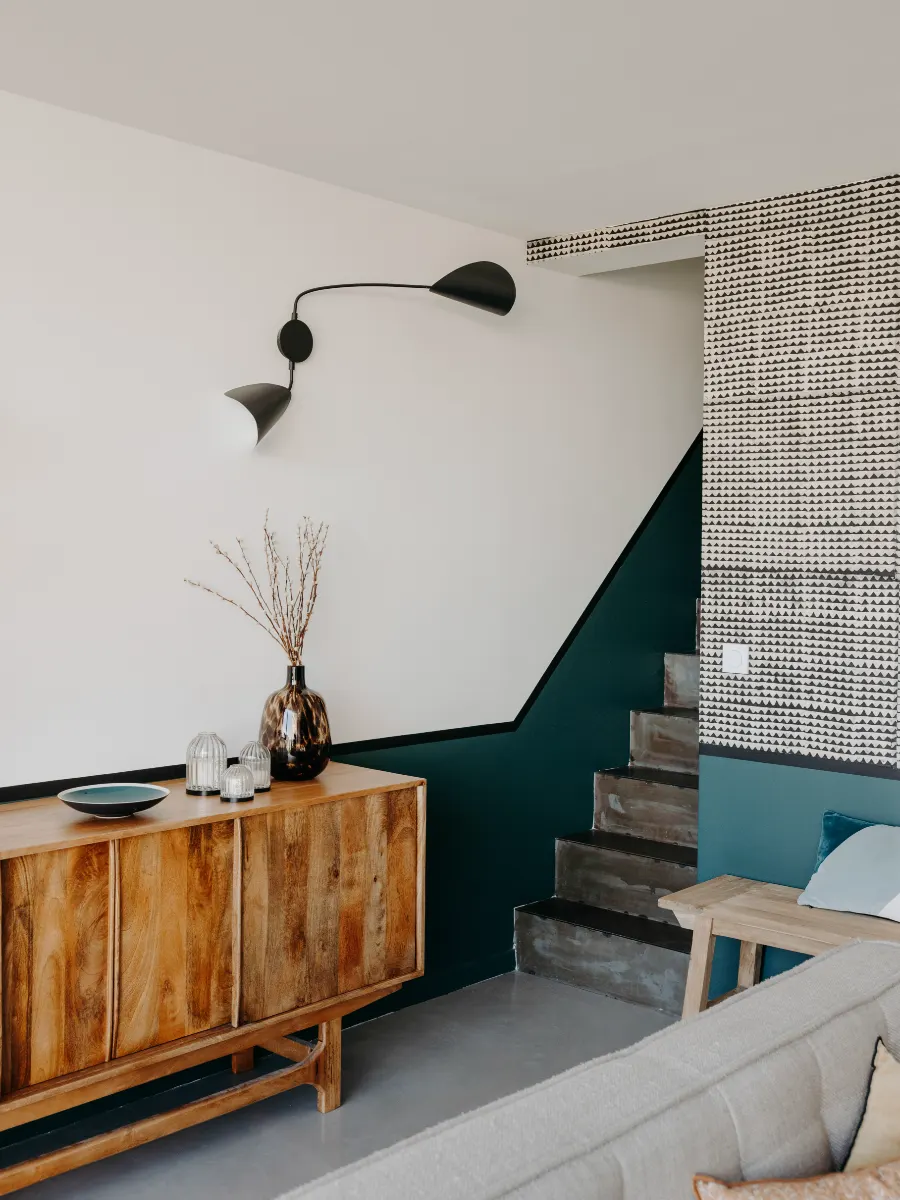 L’entrée, assez compacte et dotée de plafonds bas, mène directement à l’escalier. Pour inciter naturellement à monter vers la pièce de vie principale, j’ai choisi d’habiller le grand mur de l’escalier d’un papier peint panoramique. Véritable point focal, il apporte profondeur et caractère à l’espace tout en valorisant le volume cathédral de la cage d’escalier, en contraste avec les plafonds plus bas du rez-de-chaussée.