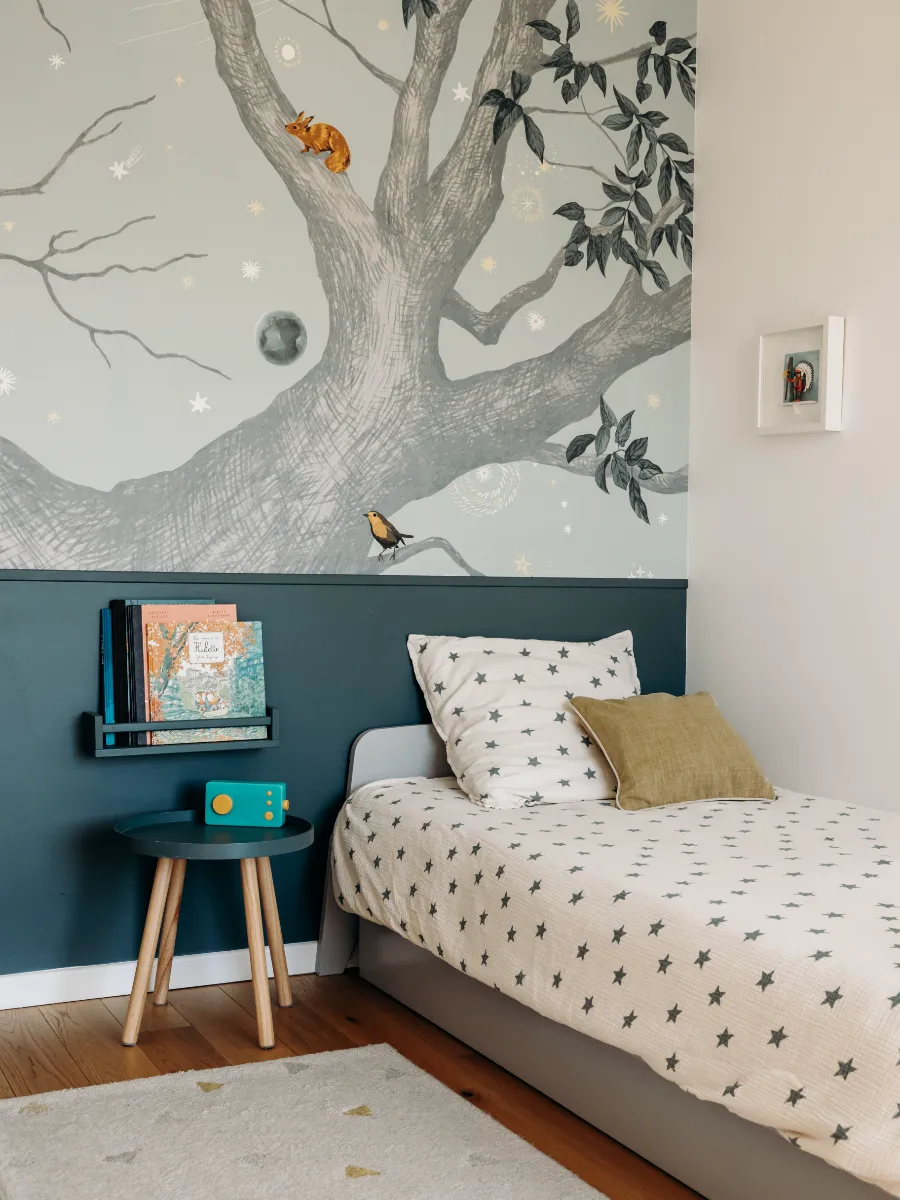 Une première chambre d’enfant inspirée de la nature, entre poésie et imagination, où la fresque murale invite aux rêves et aux aventures.