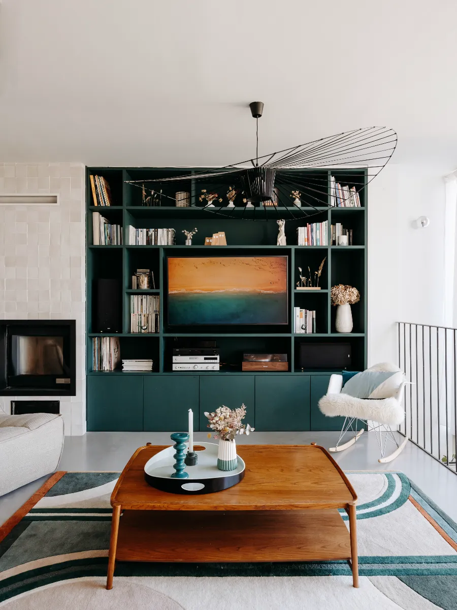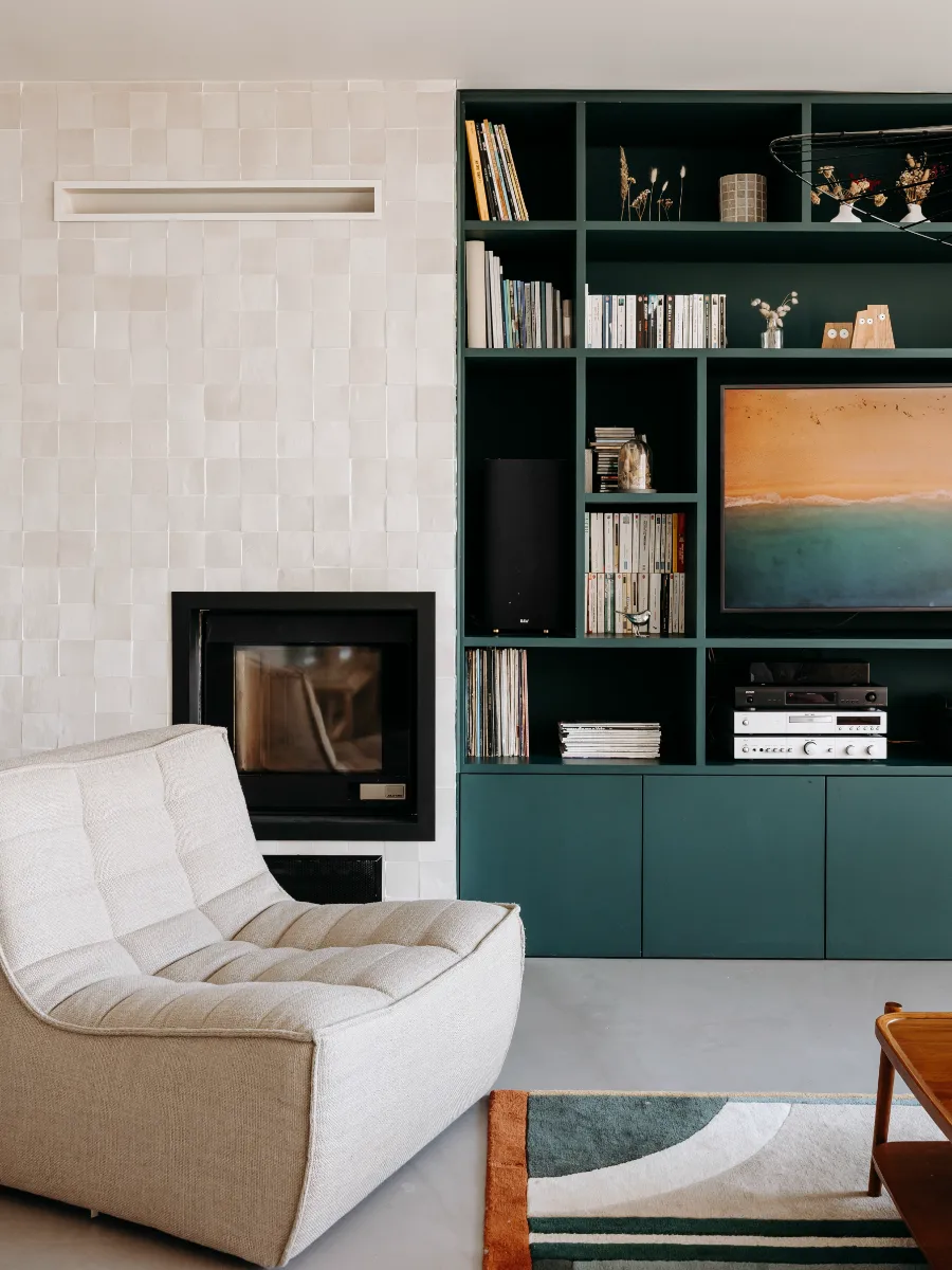 La décoration du salon s’est ensuite construite autour de cette bibliothèque, véritable fil conducteur de la pièce : une palette de verts, de beiges, d’ocre et des touches de noirs se décline dans les tissus, les luminaires et les accessoires, créant une atmosphère élégante, cohérente et chaleureuse.
