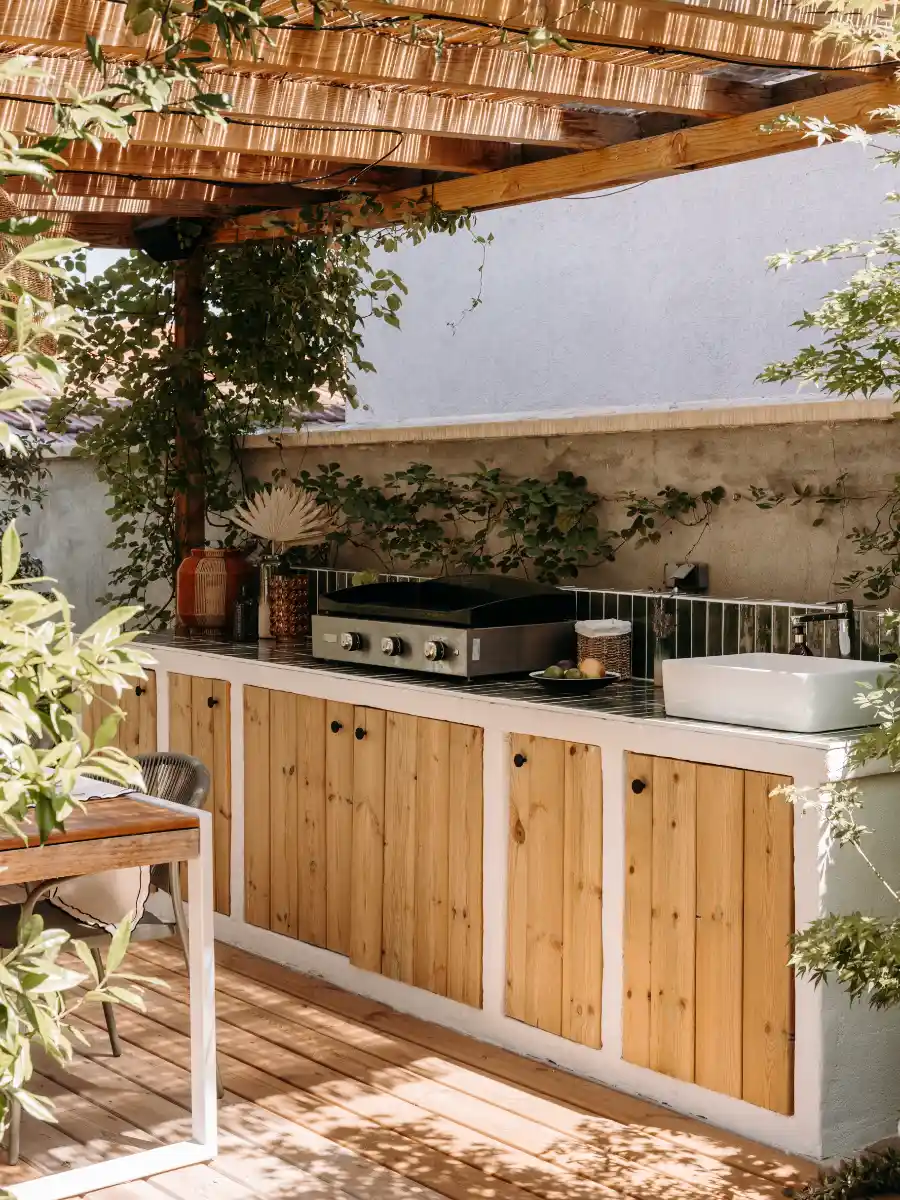 Sous une pergola en bois tressé qui filtre joliment la lumière, la cuisine s’organise autour d’un grand plan de travail carrelé, d’une plancha intégrée et d’un évier fonctionnel : tout pour cuisiner dehors aussi confortablement qu’à l’intérieur.