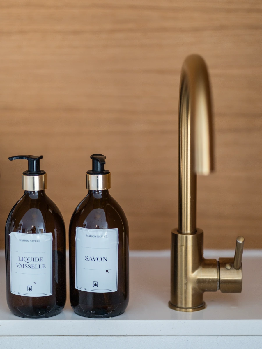 Pour optimiser le budget, nous avons choisi une cuisine IKEA que nous avons personnalisée afin de lui donner plus de caractère et d’élégance : habillages en bois, jolies poignées en laiton et plan de travail en quartz.