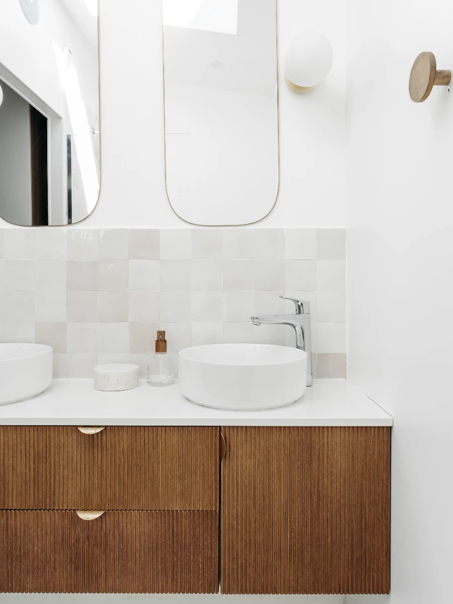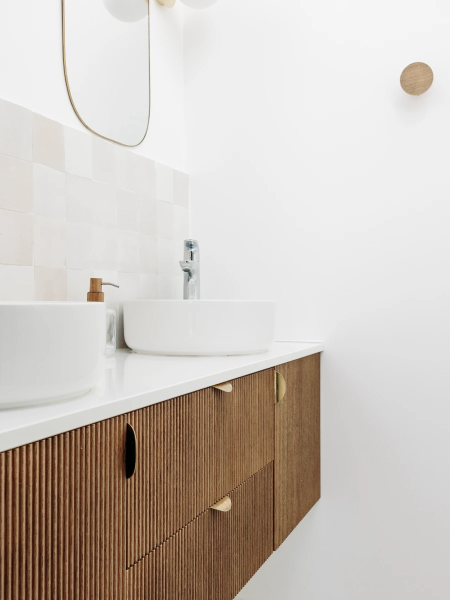 Dans la salle de bain attenante, j’ai cherché à préserver la légèreté de l’espace. Pour éviter un meuble vasque trop massif, j’ai détourné des meubles de cuisine IKEA que j’ai habillés de façades en bois plissé signées Bocklip. Ce mélange de simplicité et de raffinement met
