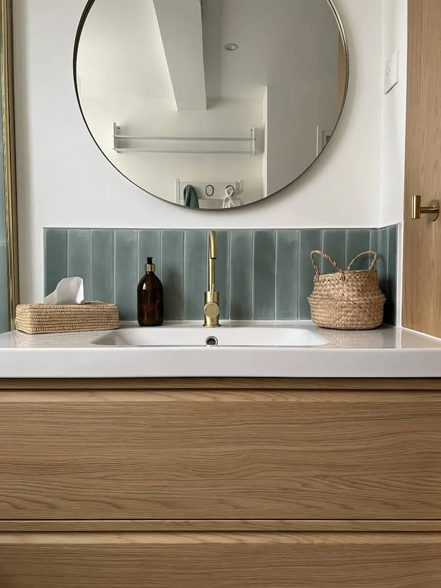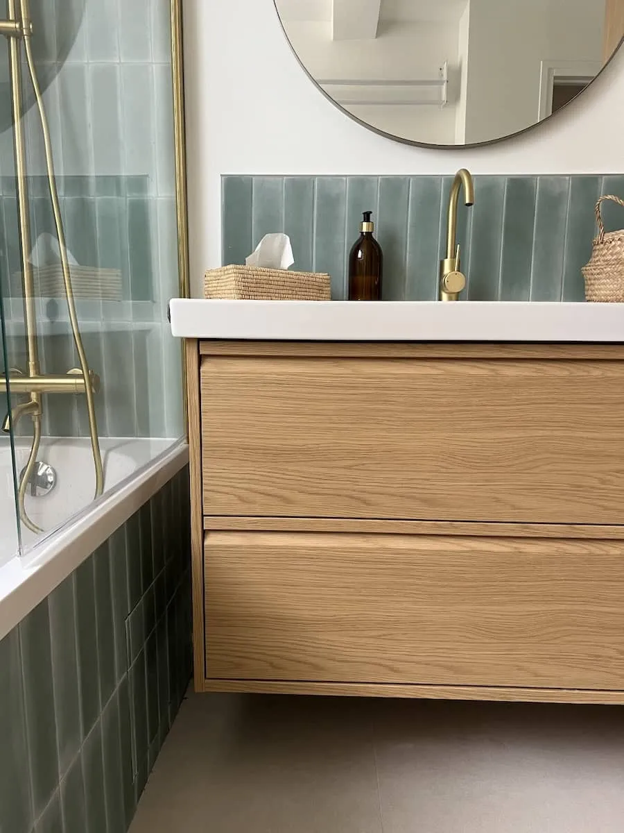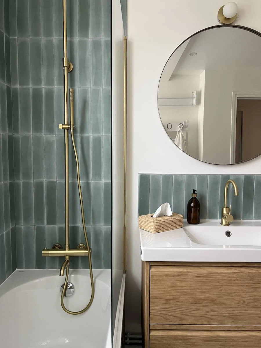 La salle de bain s’articule autour d’un carrelage effet zellige vert, qui offre un subtil jeu de textures et de nuances. Sa pose verticale permet d’élancer visuellement l’espace et de lui donner plus de hauteur.